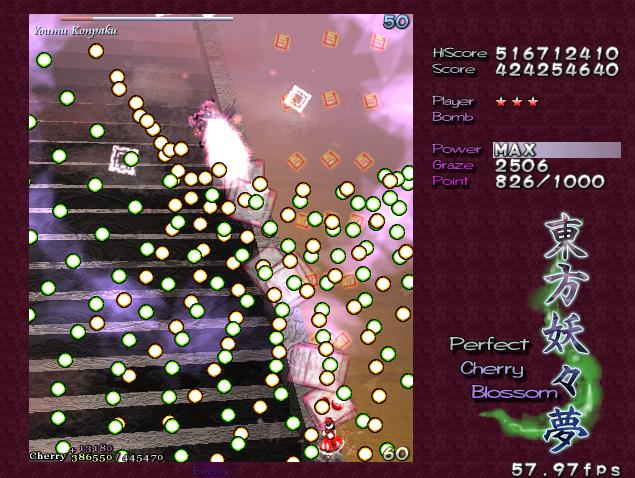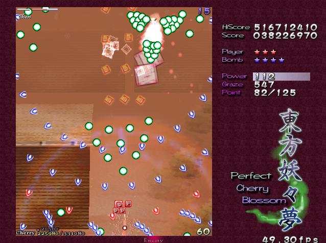 と思いつつ進んでとりあえずゆゆ様戦突入、0機2ボムで通常で1回使ってスペカ1は取得して1000Pエクステンド!